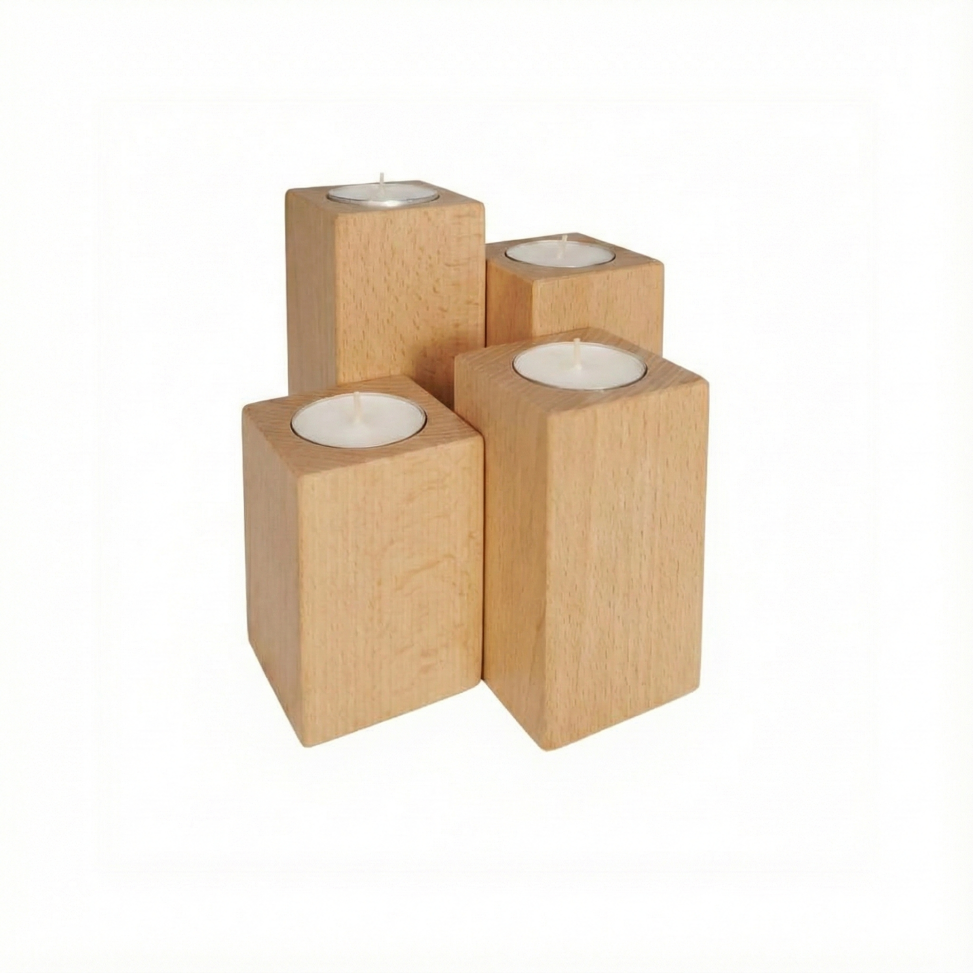 Vier massive Holzsäulen in Treppenform, liebevoll von Hand gearbeitet. Ein robuster, zeitloser Blickfang für 4 Teelichter – ideal auch als moderner und nachhaltiger Adventskranz.